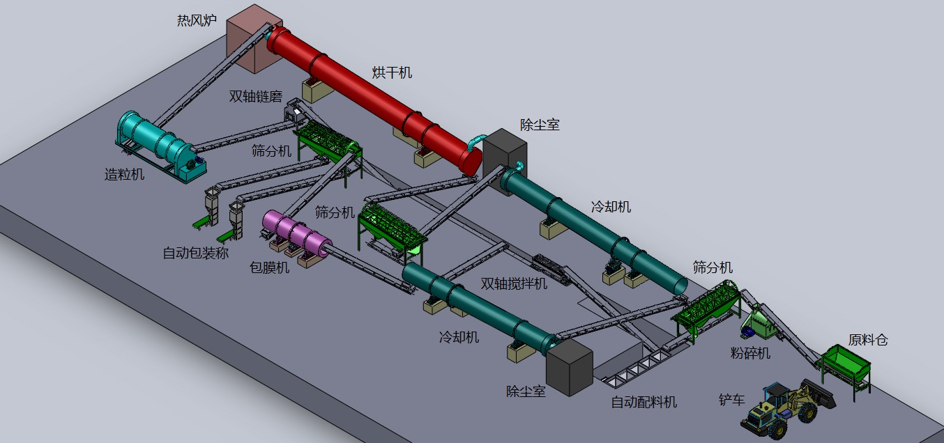 中配置:半濕物料粉碎機(jī)、臥式攪拌機(jī)、造粒機(jī)、烘干機(jī)、冷卻機(jī)、滾筒篩分機(jī)、包裝設(shè)備、皮帶輸送機(jī)等。